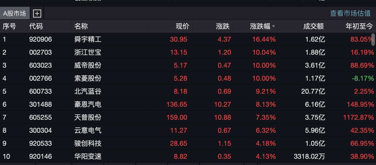 具體來(lái)看,wind資訊數(shù)據(jù)顯示,汽車(chē)與零部件板塊多股大漲,截至記者發(fā)稿時(shí),成分股中浙江世寶、威帝股份、索菱股份3股漲停,舜宇精工漲超16%,豪恩汽電、北汽藍(lán)谷、天普股份等多股跟漲,北汽藍(lán)谷逼近漲停。