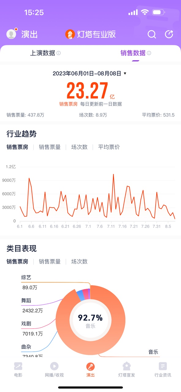 今年暑期演出市場持續(xù)爆發(fā),據(jù)燈塔專業(yè)版數(shù)據(jù)顯示,暑期檔(6月1日-8月8日),演出市場票房為23.27億元。較疫情前2019年同期,演出觀演人次翻倍,演出票房增長168%。從演出內(nèi)容上來看,整體音樂品類(演唱會/音樂節(jié))最受歡迎,演唱會演出場次同2019年基本相當,但大型項目增加,場均的觀演人次較之前增長2倍;音樂節(jié)供給明顯增長,演出場次增長近2倍。
