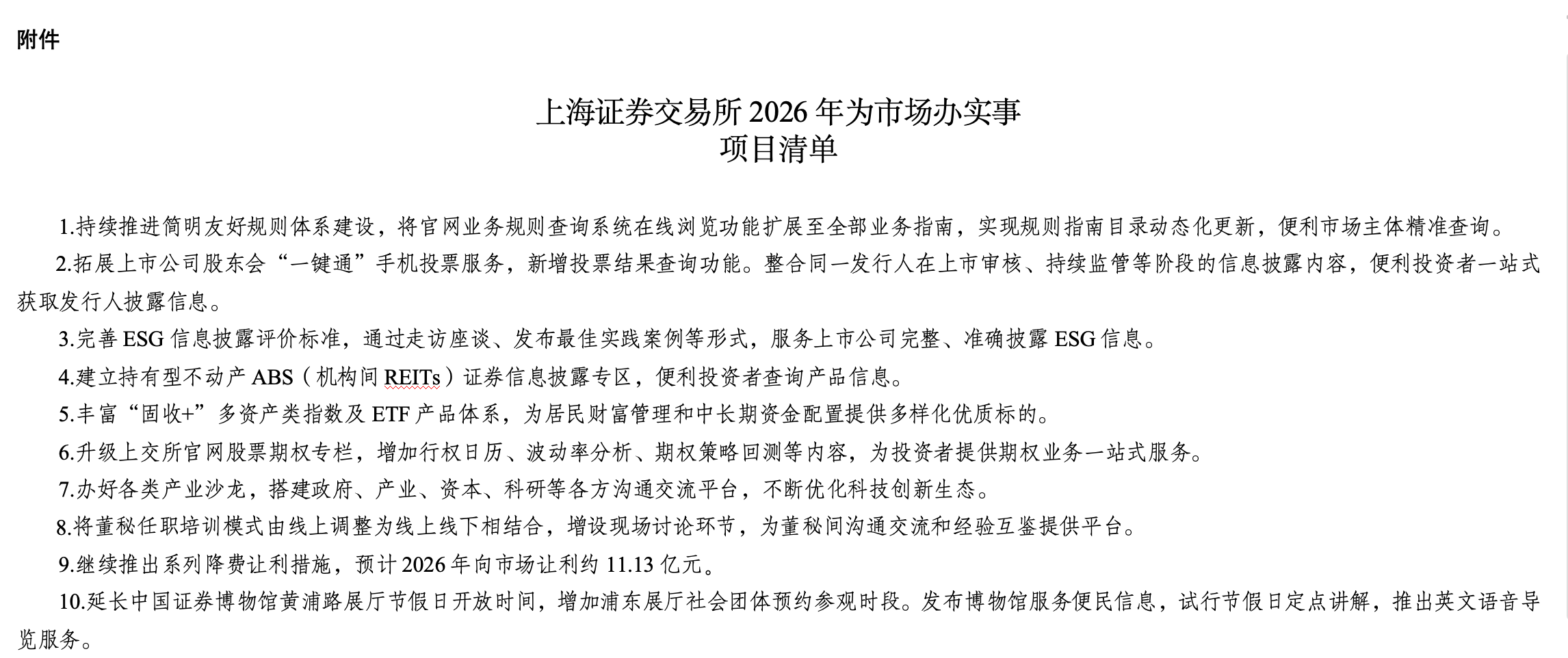 本報訊 (記者毛藝融)為推動中央八項規(guī)定精神在上海證券交易所(以下簡稱“上交所”)落實落細,進一步深化“開門辦審核、開門辦監(jiān)管、開門辦服務(wù)”工作,上交所在認真研究市場各方訴求基礎(chǔ)上,結(jié)合交易所實際,梳理形成了《上海證券交易所2026年為市場辦實事項目清單》(以下簡稱《項目清單》),近日正式對外發(fā)布。