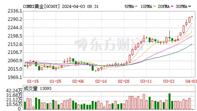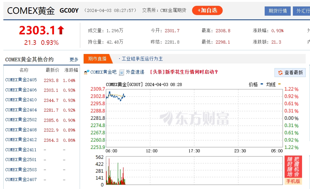 早盤國際金價(jià)升破2300美元(供圖:東方財(cái)富)