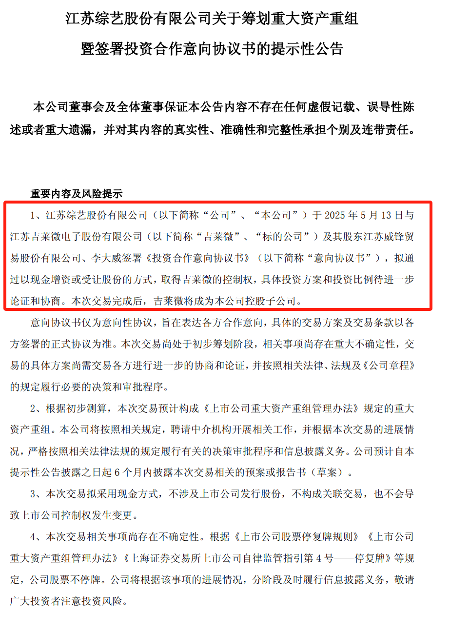 5月13日晚間,江蘇綜藝股份有限公司(以下簡稱“綜藝股份”,股票代碼:600770)發(fā)布公告稱,公司于當日與江蘇吉萊微電子股份有限公司(以下簡稱“吉萊微”)及其股東江蘇威鋒貿(mào)易股份有限公司、李大威簽署《投資合作意向協(xié)議書》,擬通過以現(xiàn)金增資或受讓股份的方式,取得吉萊微的控制權(quán)。
