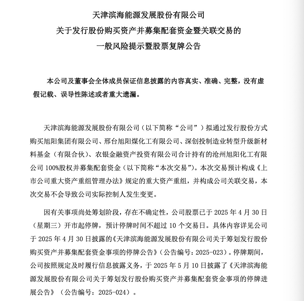 5月16日,濱海能源召開(kāi)第十一屆董事會(huì)第二十次會(huì)議,審議通過(guò)了《關(guān)于公司發(fā)行股份購(gòu)買(mǎi)資產(chǎn)并募集配套資金暨關(guān)聯(lián)交易方案的議案》《關(guān)于<天津?yàn)I海能源發(fā)展股份有限公司發(fā)行股份購(gòu)買(mǎi)資產(chǎn)并募集配套資金暨關(guān)聯(lián)交易預(yù)案>及其摘要的議案》等相關(guān)議案。公司股票將于5月19日(星期一)開(kāi)市起復(fù)牌。