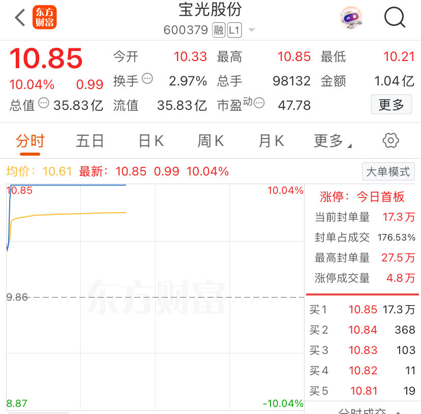 5月21日,陜西寶光真空電器股份有限公司(以下簡稱“寶光股份”,證券代碼600379)開盤后迅速漲停。截至記者發(fā)稿,仍有17.3萬手封板。