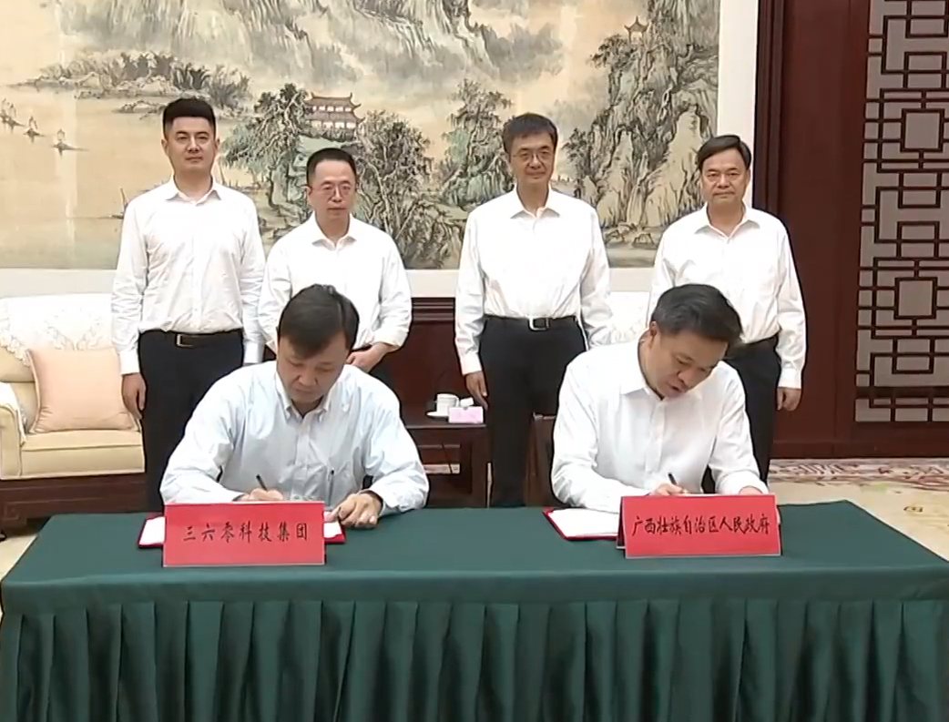 本報(bào)訊 (記者袁傳璽)6月3日,廣西壯族自治區(qū)政府與三六零科技集團(tuán)有限公司(以下簡稱“360集團(tuán)”)在南寧簽署戰(zhàn)略合作協(xié)議,就面向廣西及東盟的人工智能和數(shù)字安全等相關(guān)產(chǎn)業(yè)達(dá)成一系列戰(zhàn)略合作。自治區(qū)黨委書記、自治區(qū)人大常委會主任陳剛、360集團(tuán)創(chuàng)始人周鴻祎等見證簽約儀式。