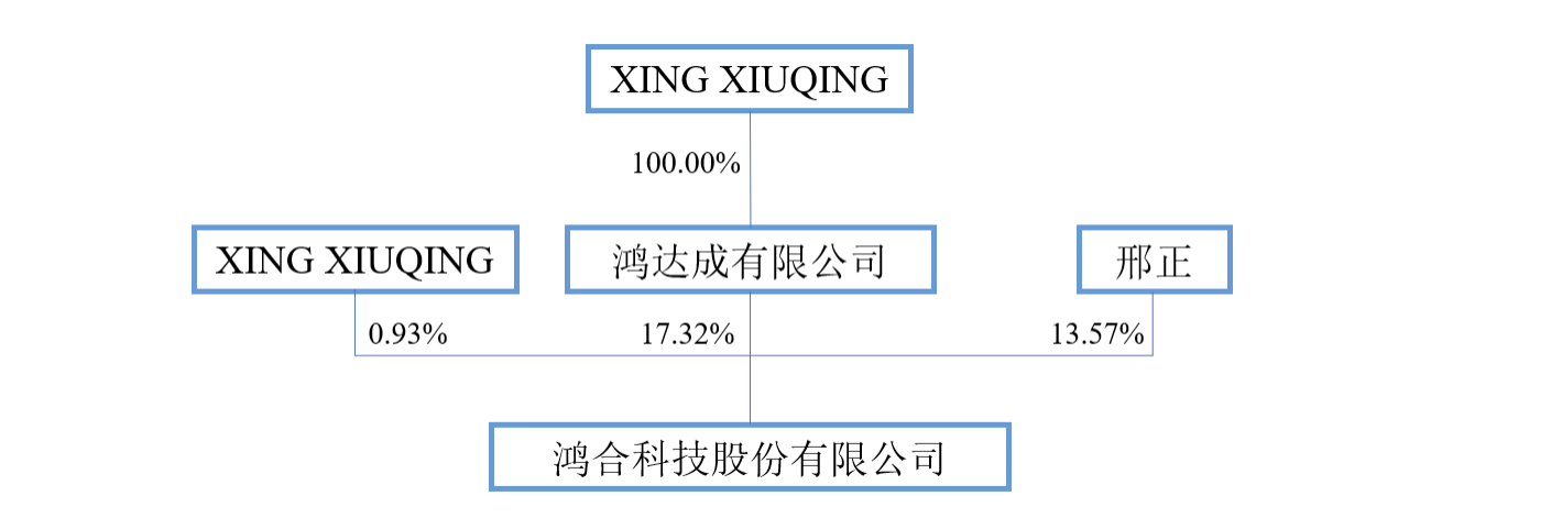 公開資料顯示,鴻合科技實際控制人為自然人股東邢正、XINGXIUQING,他們與鴻達成有限公司(以下簡稱“鴻達成”)屬于一致行動人關(guān)系。截至2024年12月31日,邢正直接持有公司13.57%股份;XINGXIUQING直接持有公司0.93%的股份,通過鴻達成間接享有公司表決權(quán)比例為17.32%。