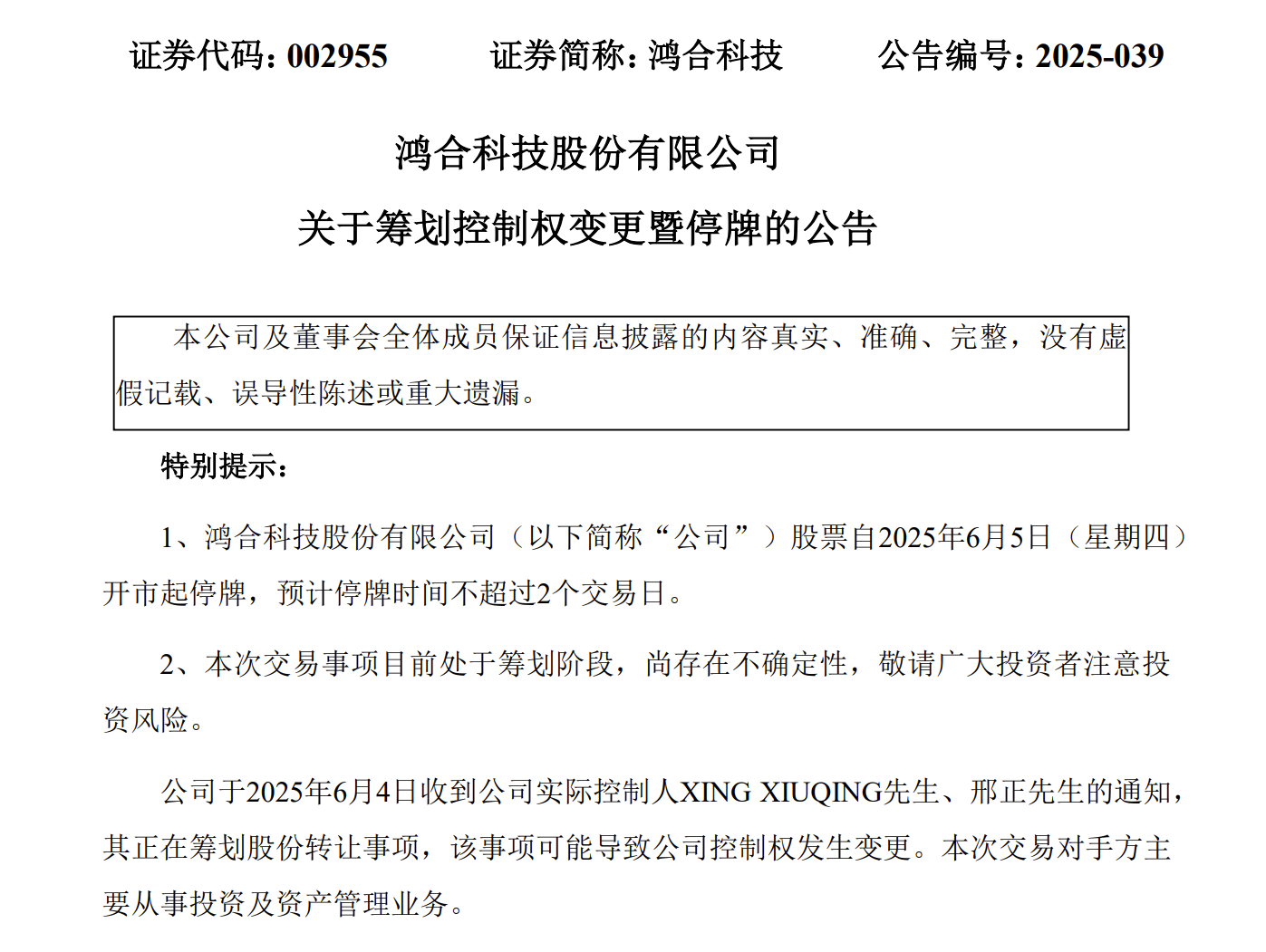 公告顯示,鴻合科技于6月4日收到公司實際控制人XINGXIUQING、邢正的通知,其正在籌劃股份轉(zhuǎn)讓事項,該事項可能導(dǎo)致公司控制權(quán)發(fā)生變更。此次交易對手方主要從事投資及資產(chǎn)管理業(yè)務(wù)。