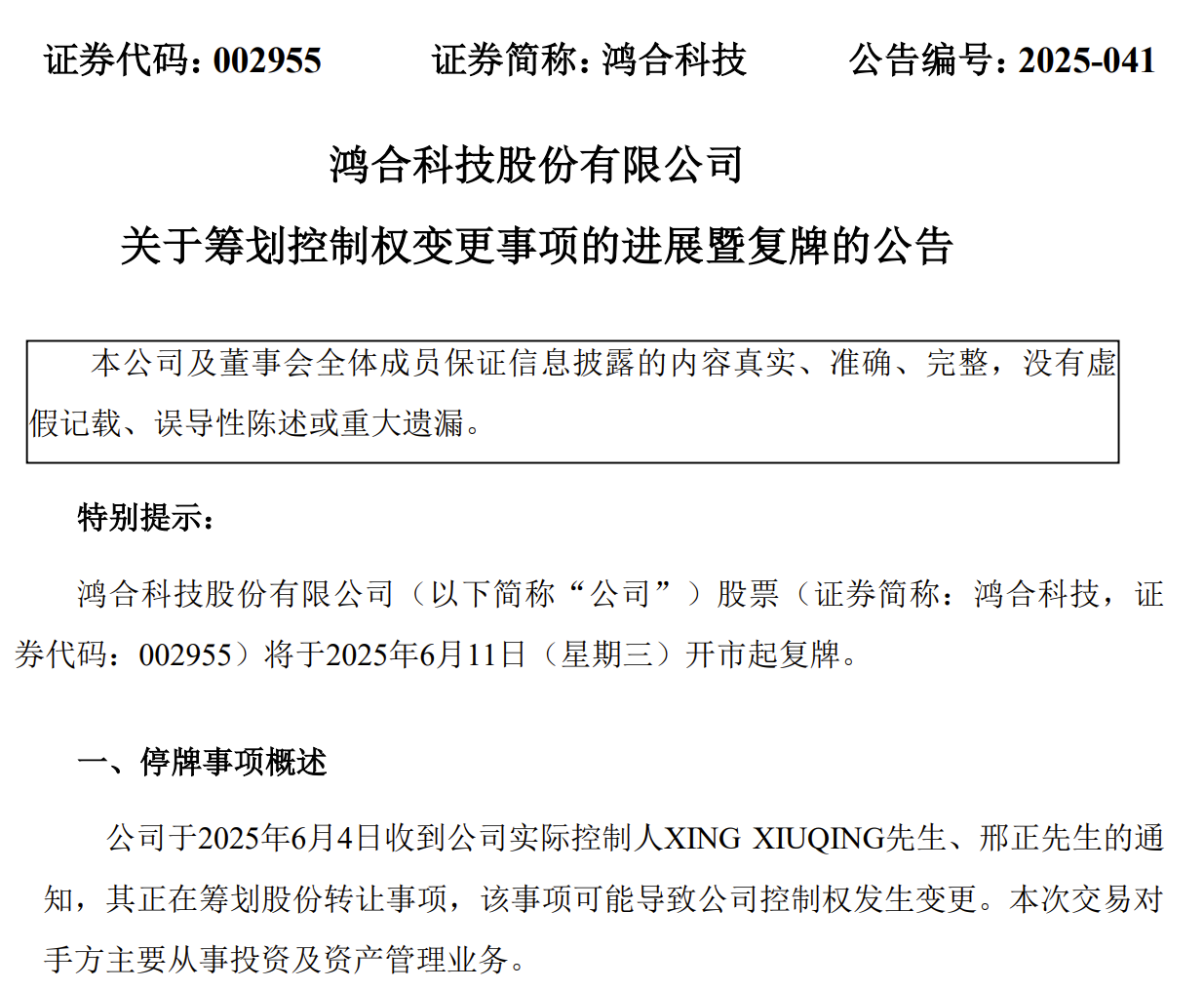 6月10日晚間,鴻合科技股份有限公司(以下簡稱“鴻合科技”,002955)披露公告,鴻合科技控制權(quán)擬發(fā)生變更,公司股票將于2025年6月11日開市起復(fù)牌。