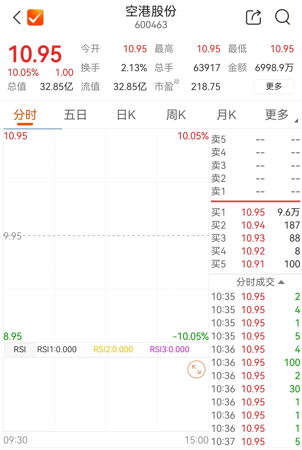 6月19日,北京空港科技園區(qū)股份有限公司(以下簡稱“空港股份”;股票代碼:600463)開盤即漲停,報10.95元/股,總市值32.85億元。