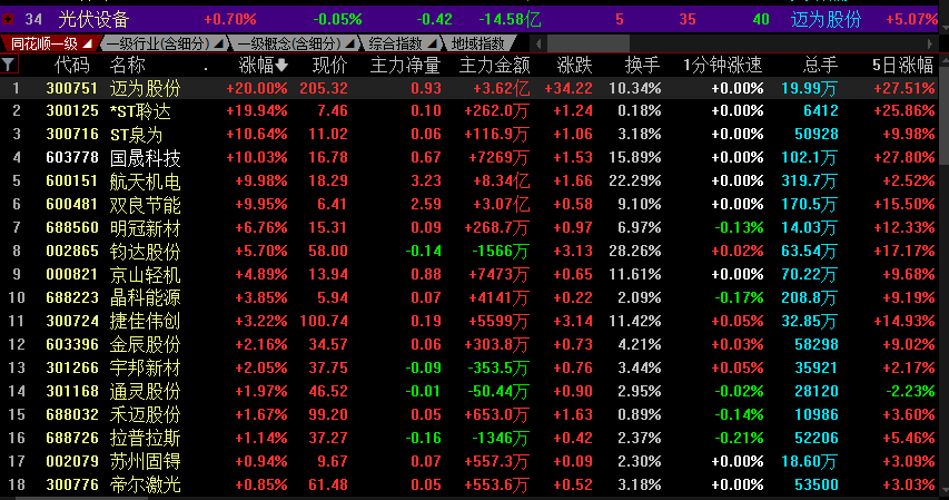 本報(bào)訊 (記者向炎濤)12月29日,同花順光伏設(shè)備概念板塊震蕩走強(qiáng),其中異質(zhì)結(jié)、鈣鈦礦電池方向領(lǐng)漲。截至當(dāng)日收盤,邁為股份(300751)20%漲停、*ST聆達(dá)(300125)19.94%漲停,航天機(jī)電(600151)、雙良節(jié)能(600481)、國晟科技(603778)等個(gè)股“10cm”漲停。其中,國晟科技(603778)股價(jià)創(chuàng)新高,報(bào)收16.78元每股,總市值110.2億元。