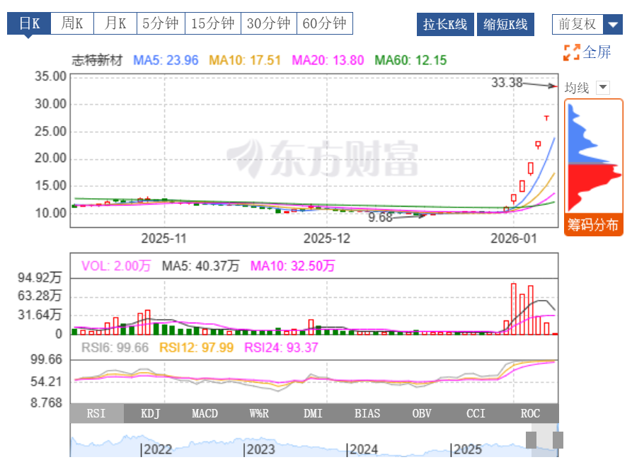 1月12日晚間,江西志特新材料股份有限公司(以下簡(jiǎn)稱“志特新材”,300986.SZ)發(fā)布公告稱,公司股票自2026年1月5日至1月12日連續(xù)6個(gè)交易日漲停,漲幅為198.57%,股價(jià)波動(dòng)較大。為維護(hù)投資者利益,公司將就股票交易波動(dòng)情況進(jìn)行核查。經(jīng)申請(qǐng),公司股票自1月13日開市起停牌,預(yù)計(jì)停牌時(shí)間不超過3個(gè)交易日。公司提醒投資者注意二級(jí)市場(chǎng)交易風(fēng)險(xiǎn)。