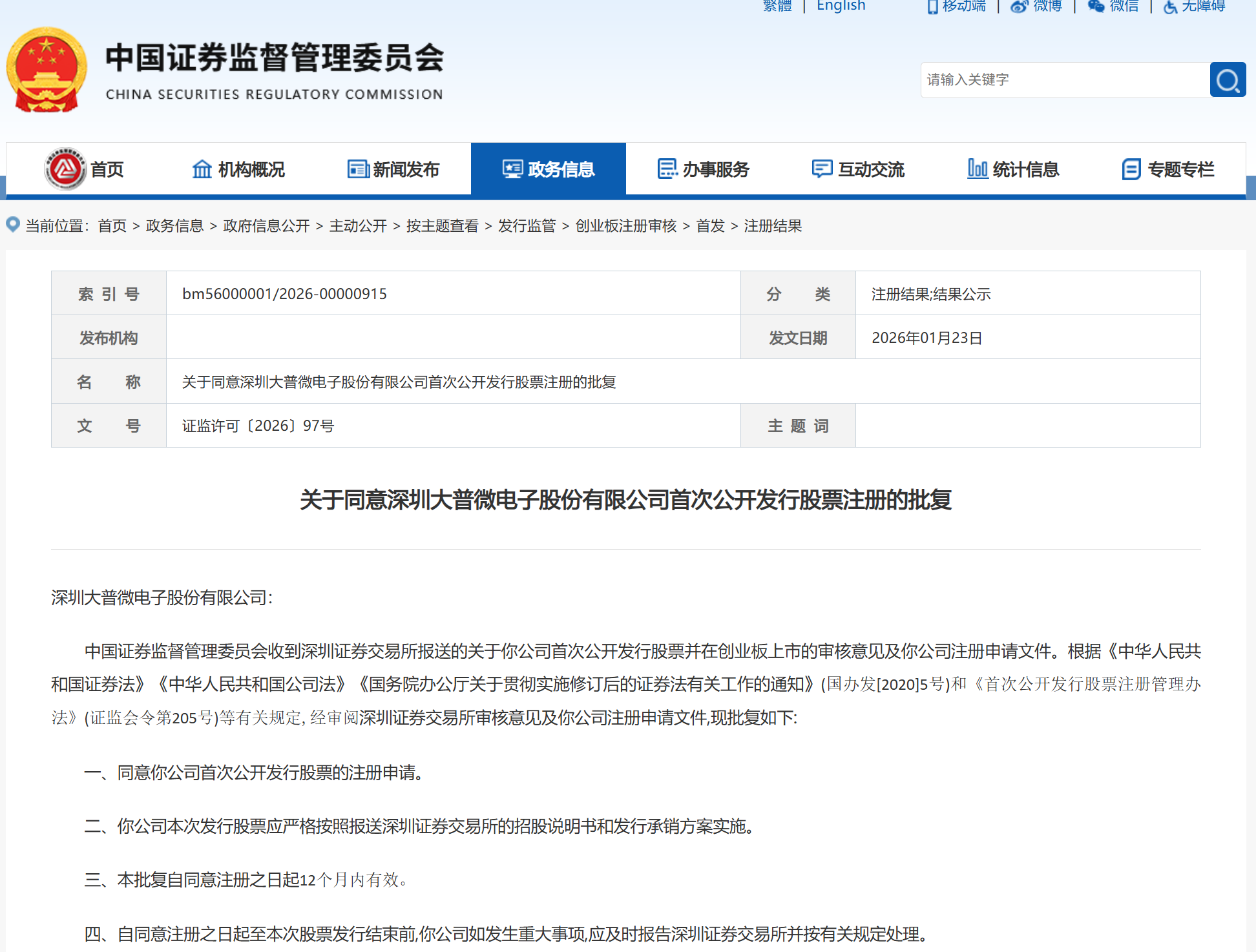 2026年1月23日,證監(jiān)會(huì)官網(wǎng)顯示,深圳大普微電子股份有限公司(以下簡(jiǎn)稱“大普微”)IPO注冊(cè)獲批,標(biāo)志著大普微距離登陸資本市場(chǎng)更近一步。
