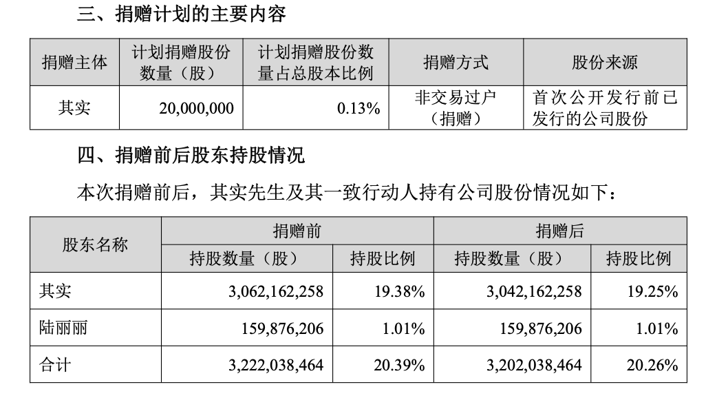 據(jù)公告披露,本次捐贈前后,其實及其一致行動人陸麗麗合計持有東方財富股份比例從20.39%降至20.26%。同時,東方財富也明確表示,本次捐贈事項不會導(dǎo)致公司控股股東發(fā)生變化,不會對公司治理結(jié)構(gòu)及持續(xù)經(jīng)營產(chǎn)生重大影響。
