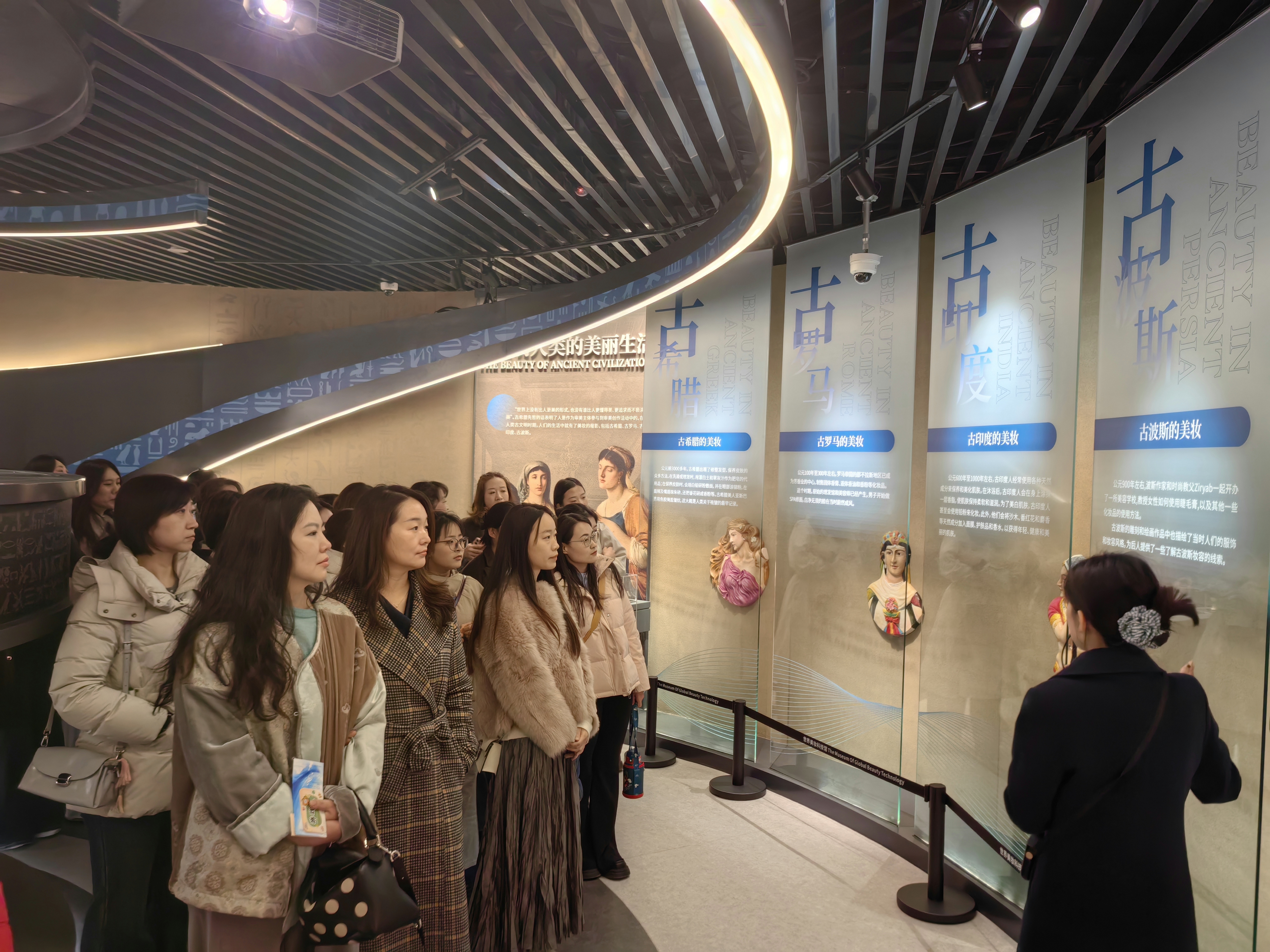 福瑞達(dá)智美科創(chuàng)園內(nèi)的世界美妝科技館中,講解員正帶領(lǐng)當(dāng)天來參與活動的游客穿越數(shù)千年美妝史。從尼羅河畔的化妝容器,到現(xiàn)代基因護(hù)膚的前沿探索,這座國內(nèi)首個美妝主題科技館用豐富的展品和互動裝置,勾勒出人類對美的執(zhí)著追求。在“皮膚的秘密”互動區(qū),幾位女士通過肌理檢測儀了解自己的膚質(zhì),在AI變妝裝置前互動拍照。