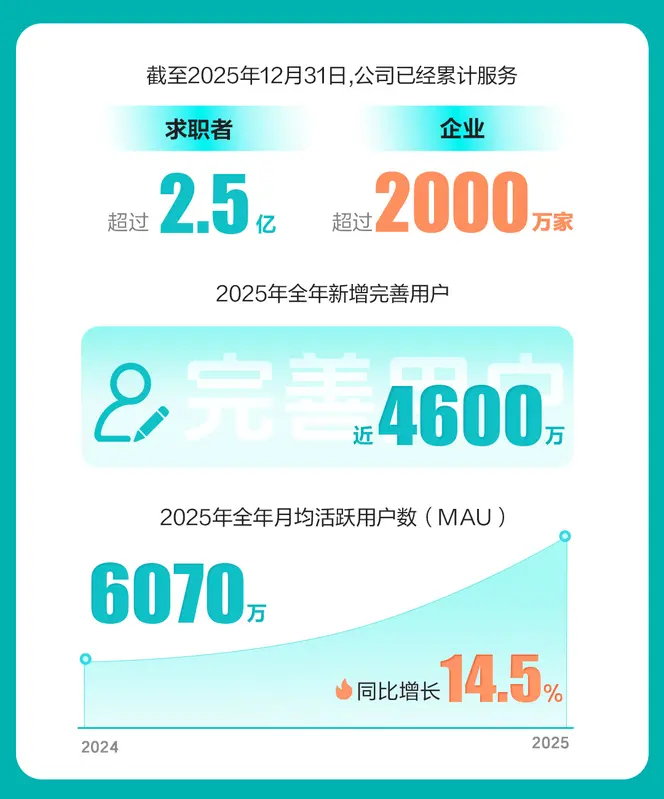 截至2025年12月31日止的十二個月內(nèi),公司付費企業(yè)客戶數(shù)達(dá)680萬,同比上漲11.5%。截至2025年12月31日,公司累計服務(wù)超過2.5億求職者,服務(wù)企業(yè)總數(shù)超過2000萬家。