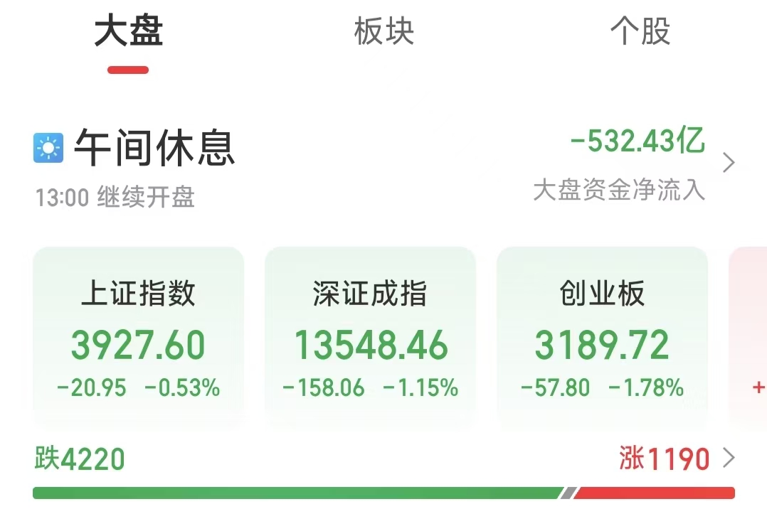 周四(4月2日),三大股指震蕩整理,板塊輪動加速。截至上午收盤,上證指數(shù)跌幅為0.53%,報3927.6點;深證成指和創(chuàng)業(yè)板指跌幅分別為1.15%和1.78%;滬深兩市合計成交額11867.04億元,總體來看,兩市個股跌多漲少,共有1190只個股實現(xiàn)上漲。