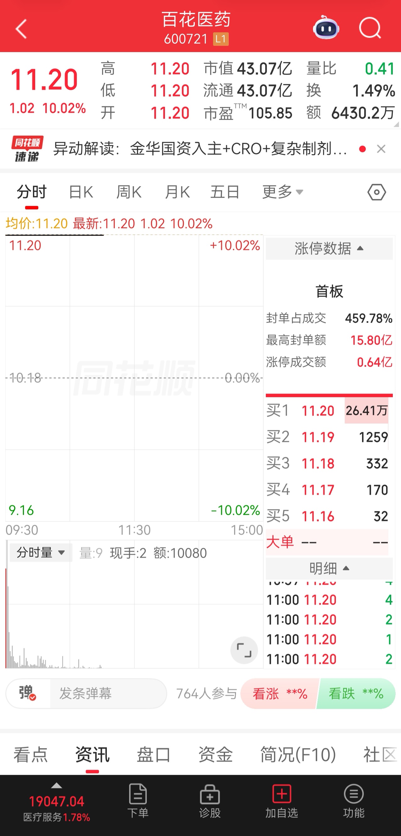4月8日,百花醫(yī)藥(證券代碼:600721)復(fù)牌首日開(kāi)盤(pán)即封漲停,報(bào)11.20元/股,截至記者發(fā)稿時(shí),漲停板仍被牢牢封死。