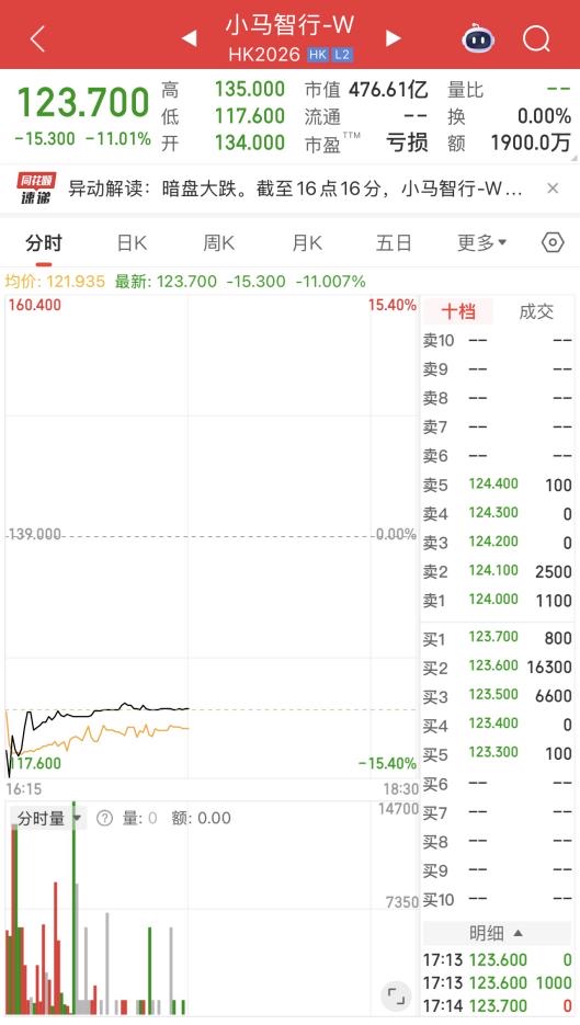 本報訊 (記者袁傳璽)11月5日,小馬智行-W(以下簡稱“小馬智行”)港股暗盤開盤跌超15%,截至17:15,跌幅收窄至11.01%,報價123.7港元/股。據(jù)了解,小馬智行確定全球發(fā)售最終發(fā)售價為每股139.00港元,全球發(fā)售所得款項總額(未扣除包銷費用及開支)預(yù)計約67.1億港元。