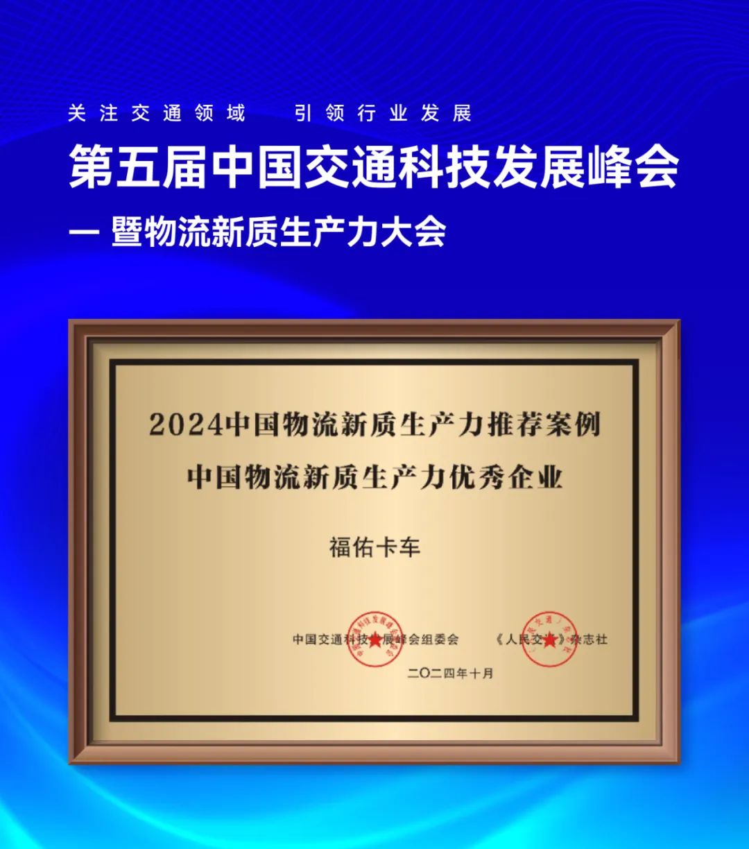 10月22日,在第五屆中國交通科技發(fā)展峰會暨物流新質(zhì)生產(chǎn)力大會上,福佑卡車因在智慧物流、數(shù)據(jù)要素等方面的創(chuàng)新實踐,獲評“2024中國物流新質(zhì)生產(chǎn)力優(yōu)秀企業(yè)”。