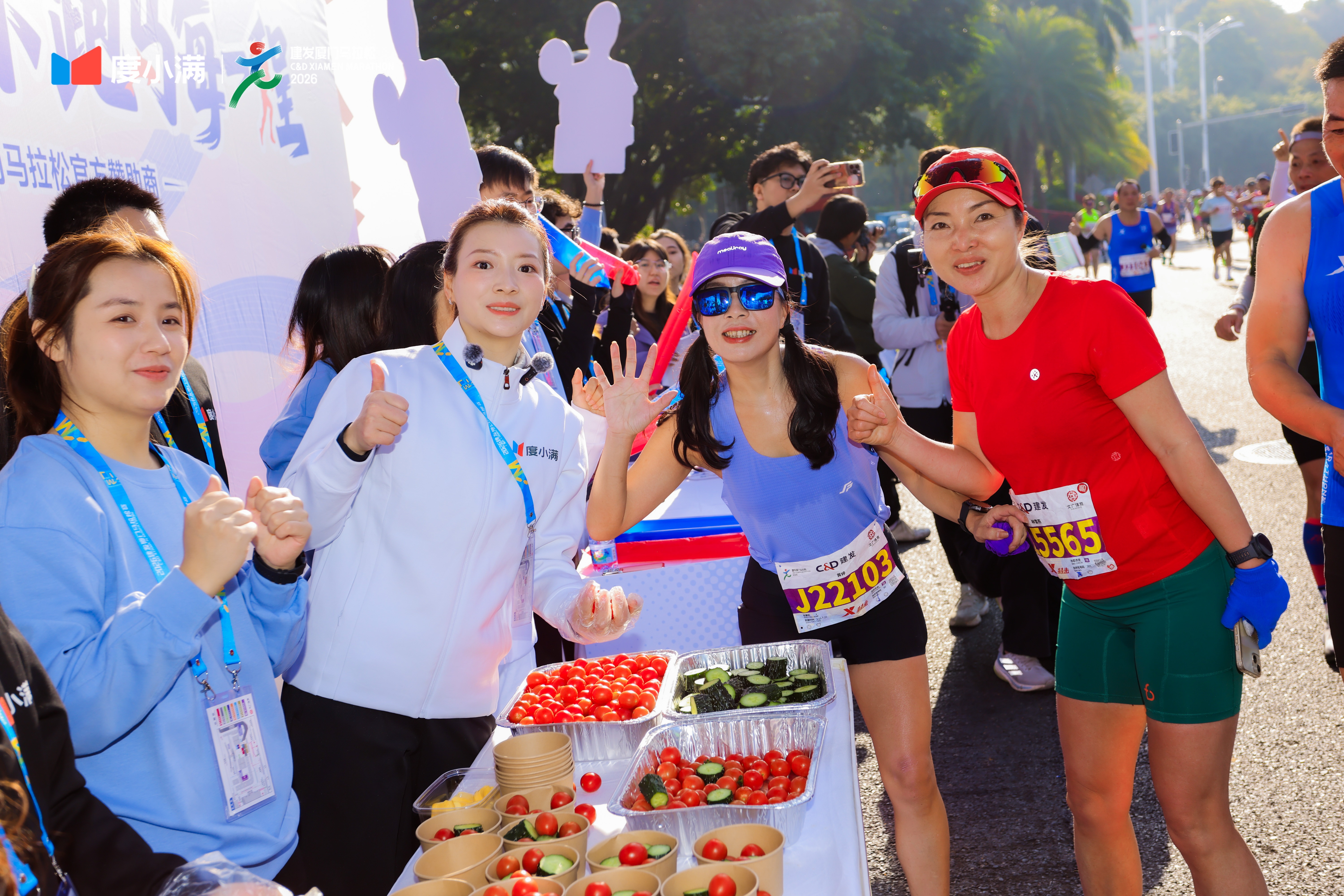 在比賽當(dāng)天,巴黎奧運(yùn)會(huì)羽毛球混雙冠軍黃雅瓊現(xiàn)身廈馬賽道17.7公里處的度小滿補(bǔ)給點(diǎn),為途經(jīng)的跑者送上貼心補(bǔ)給、加油助威,希望他們安全完賽并取得理想的好成績(jī)。