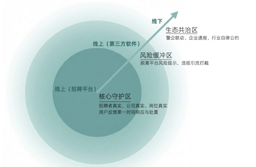 2025年,BOSS直聘根據(jù)求職場(chǎng)景與風(fēng)控系統(tǒng)覆蓋能力,將求職安全保護(hù)拆分為核心守護(hù)區(qū)、風(fēng)險(xiǎn)緩沖區(qū)與生態(tài)共治區(qū),并聯(lián)合多方進(jìn)行全域共治。