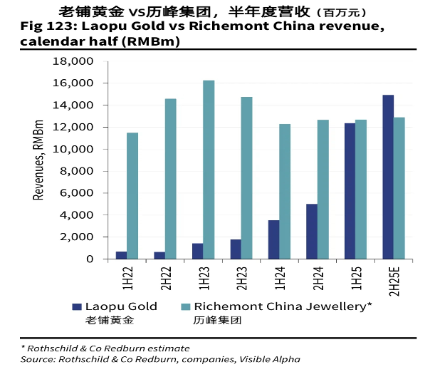 此前,該機構(gòu)在行業(yè)報告中提到,“老鋪黃金已在2025年下半年超越了歷峰集團中國珠寶業(yè)務(wù),今年的實地考察強化了這一判斷。甚至,我們?nèi)ツ甑念A(yù)測在時間點和當(dāng)前差距上過于保守。”