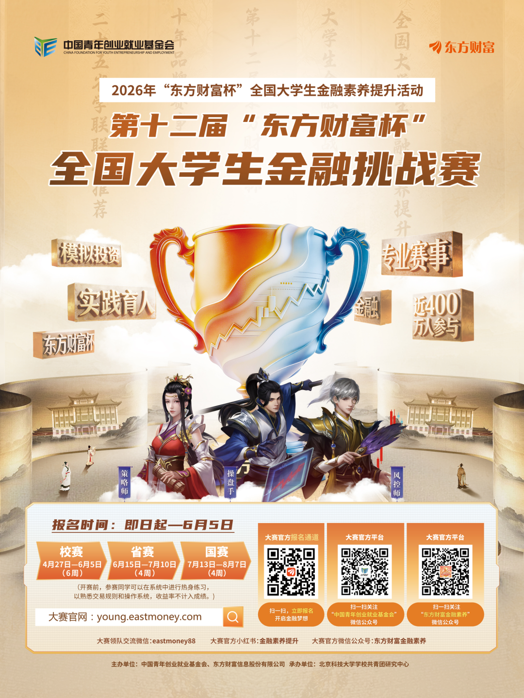 目前,大賽報名通道已全面開啟,報名時間自即日起至2026年6月5日,全國高校學(xué)生均可免費報名參賽。參賽學(xué)子可通過兩種渠道獲取報名鏈接:一是關(guān)注微信公眾號“東方財富金融素養(yǎng)”,點擊“金融大賽”-“金融挑戰(zhàn)賽”欄目;二是關(guān)注微信公眾號“中國青年創(chuàng)業(yè)就業(yè)基金會”,在對話框輸入“金融挑戰(zhàn)賽”即可。此外,掃描賽事專屬二維碼也可直接完成報名,便捷參與賽事角逐。