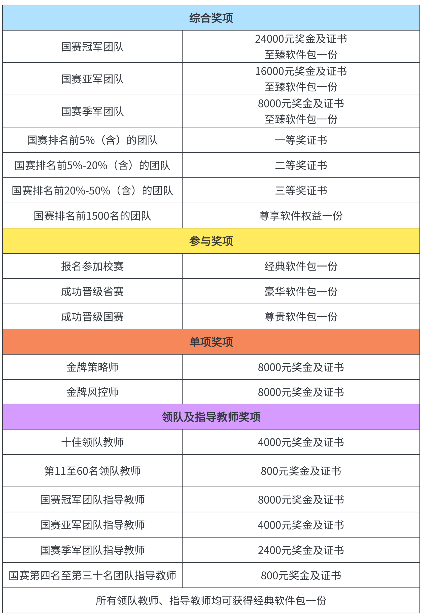 值得關(guān)注的是,本屆大賽設(shè)置了豐厚的獎勵體系,覆蓋學(xué)生、指導(dǎo)教師及領(lǐng)隊教師三大群體,不僅有豐厚的現(xiàn)金獎金、榮譽證書,還配套多等級軟件權(quán)益與專屬禮包,全方位激勵師生積極參與。同時,大賽特別增設(shè)金牌策略師、金牌風(fēng)控師單項獎,重點表彰在賽事中表現(xiàn)突出的專業(yè)型選手,進一步激發(fā)參賽學(xué)子的競技熱情與專業(yè)潛力。