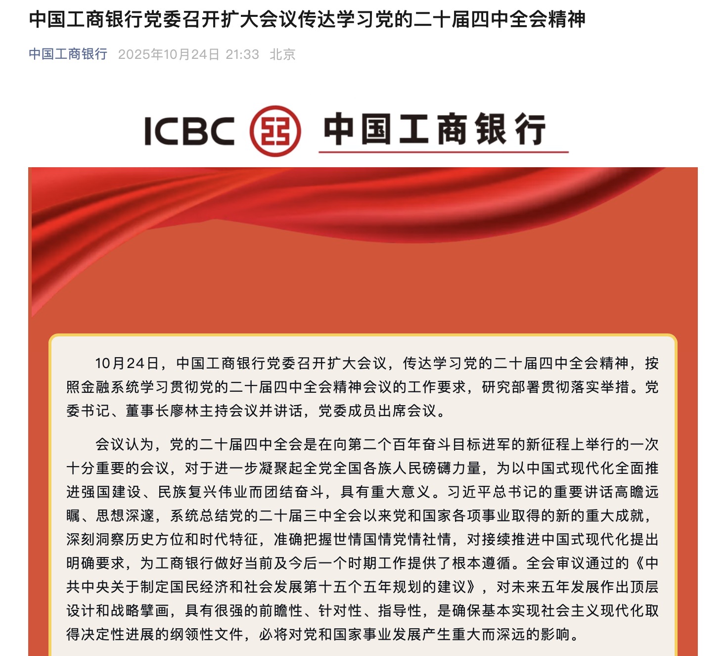 10月24日,工商銀行、農業(yè)銀行、中國銀行、建設銀行、交通銀行、郵儲銀行黨委紛紛召開會議傳達學習黨的二十屆四中全會精神,按照金融系統學習貫徹黨的二十屆四中全會精神會議的工作要求,研究部署貫徹落實舉措。