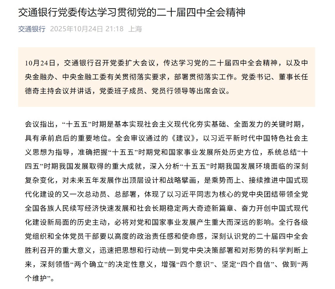 交通銀行會議要求,要全面對標全會部署要求,以國家“十五五”規(guī)劃為指引,高質量編制好交行“十五五”規(guī)劃。全面總結“十四五”時期改革發(fā)展經驗成果,用好“六個堅持”方法論,突出目標導向、問題導向,加緊謀劃重大戰(zhàn)略命題。要堅持一張藍圖繪到底,做好“十四五”“十五五”有序銜接,進一步校準戰(zhàn)略方向、突出戰(zhàn)略重點、打造戰(zhàn)略特色。