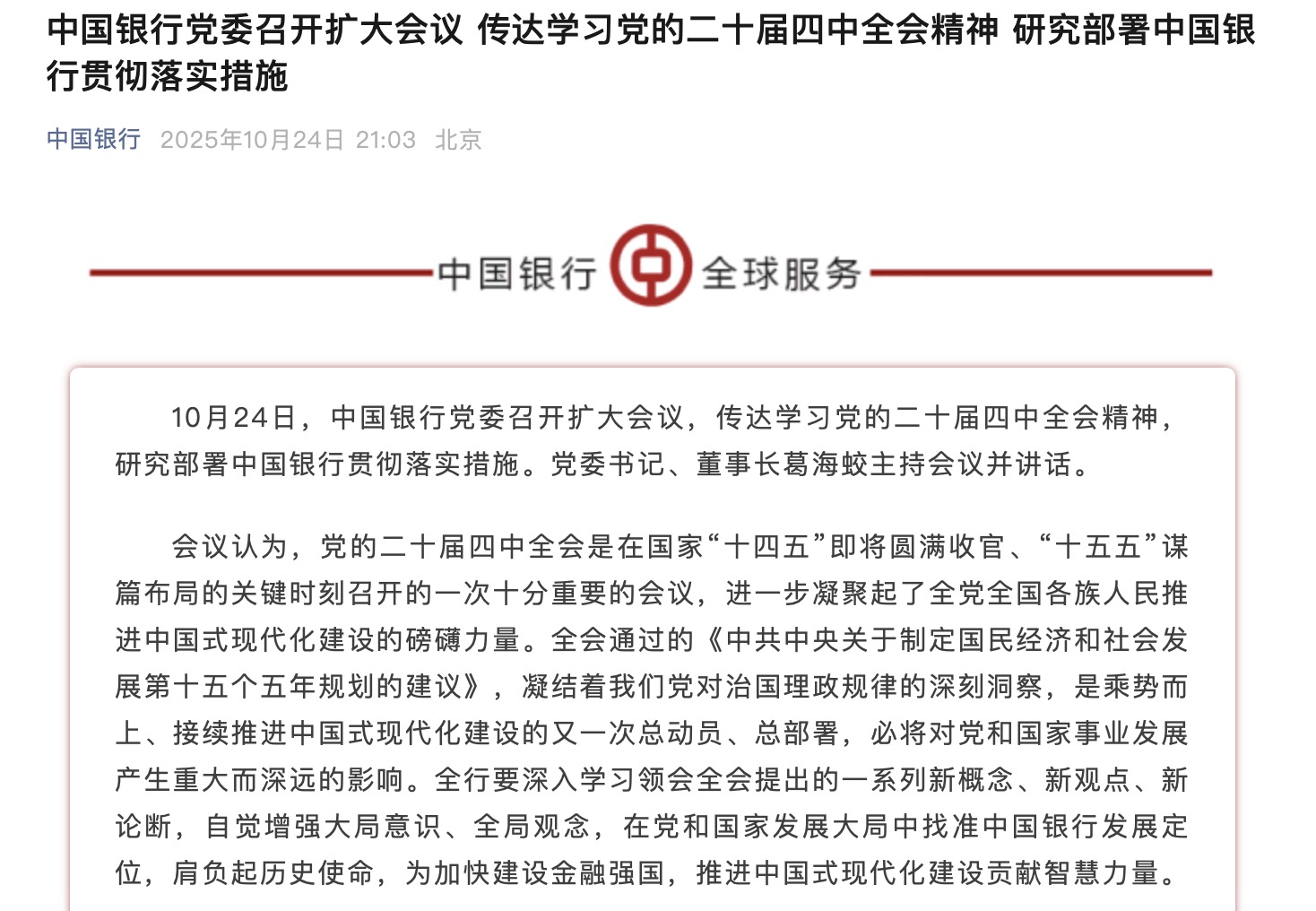 中國銀行會議強調,要堅持服務實體經濟根本宗旨,優(yōu)化金融資源配置,提升金融服務質效,深入推進做好金融“五篇大文章”,積極支持現代化產業(yè)體系智能化、綠色化、融合化發(fā)展,因地制宜支持發(fā)展新質生產力。落實提振消費專項行動,扎實做好民生保障,落實區(qū)域發(fā)展戰(zhàn)略,積極服務擴大內需戰(zhàn)略基點。要加快提升全球布局能力和國際競爭力,升級完善全球服務體系,助力推進人民幣國際化,高質量服務共建“一帶一路”國家,以更實舉措服務擴大高水平對外開放。要統籌好發(fā)展和安全,加強全面風險管理,防范化解重點領域風險,堅決守住不發(fā)生系統性風險的底線。要積極培育和弘揚中國特色金融文化,傳承中國銀行紅色基因,推動“五要五不”融入經營管理各方面全過程。