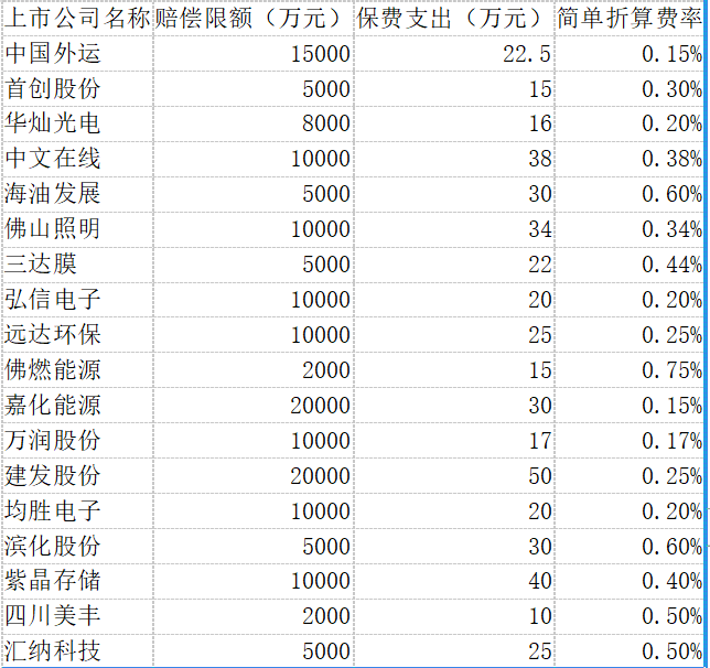 根據(jù)上市公司發(fā)布的賠償限額和保費支出進行簡單費率折算,費率最高的達2.5%,最低的為0.15%。值得注意的是,這些都擬投保計劃,最終實際投保情況可能會有調整,但從投保計劃能看出不同公司間的費率差異較為明顯(4月份發(fā)布董責險投保計劃的上市公司詳見附表)。