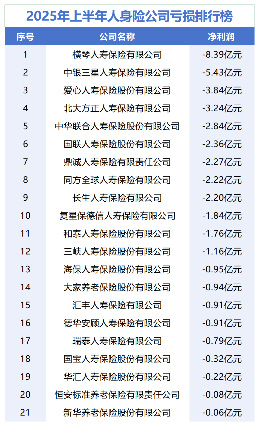 虧損險(xiǎn)企中,橫琴人壽保險(xiǎn)有限公司虧損額最高,虧損8.39億元。中銀三星人壽保險(xiǎn)有限公司、愛(ài)心人壽保險(xiǎn)股份有限公司分別虧損5.43億元、3.84億元,位列第二名、第三名。