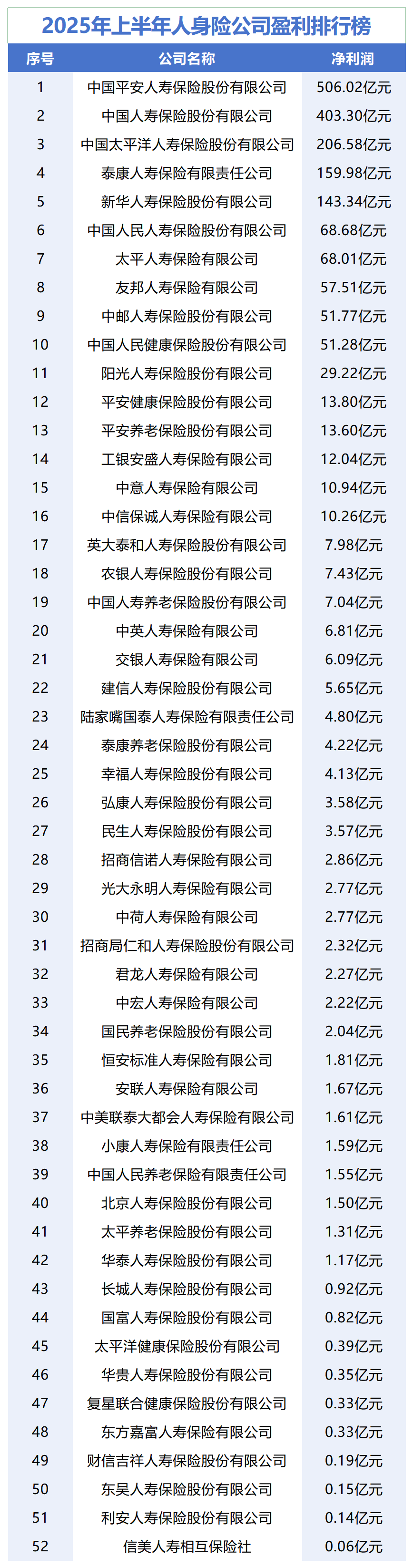 盈利險(xiǎn)企中,中國(guó)平安人壽保險(xiǎn)股份有限公司(以下簡(jiǎn)稱“平安人壽”)、中國(guó)人壽保險(xiǎn)股份有限公司(以下簡(jiǎn)稱“中國(guó)人壽”)、中國(guó)太平洋人壽保險(xiǎn)股份有限公司(以下簡(jiǎn)稱“太保壽險(xiǎn)”)、泰康人壽保險(xiǎn)有限責(zé)任公司(以下簡(jiǎn)稱“泰康人壽”)和新華人壽保險(xiǎn)股份有限公司(以下簡(jiǎn)稱“新華保險(xiǎn)”)的凈利潤(rùn)均超過(guò)100億元,分別以506.02億元、403.30億元、206.58億元、159.98億元和143.34億元凈利潤(rùn)居前五名。