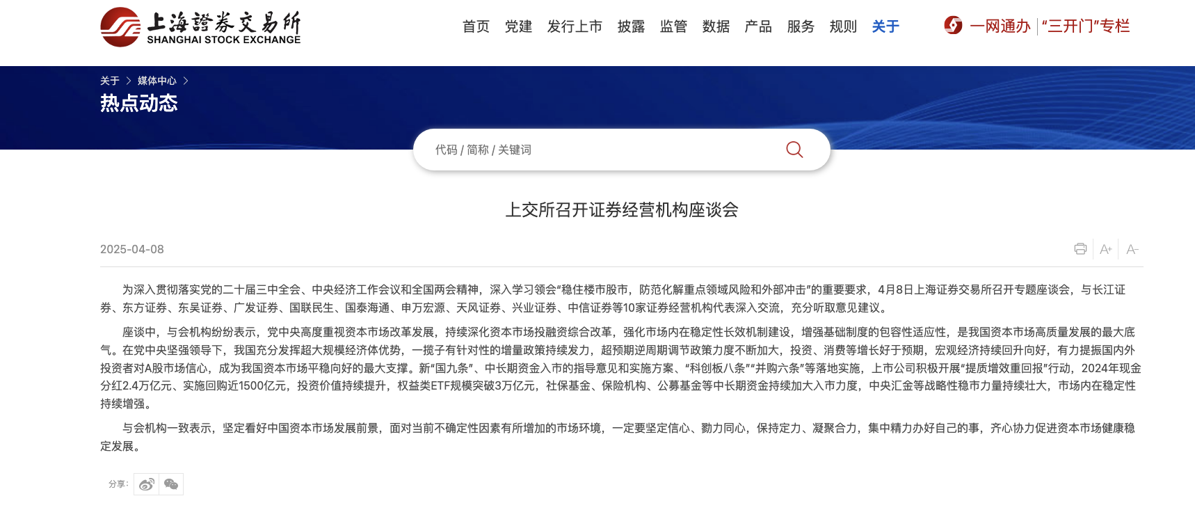 本報訊 (記者毛藝融)記者從上海證券交易所官網獲悉,為深入貫徹落實黨的二十屆三中全會、中央經濟工作會議和全國兩會精神,深入學習領會“穩(wěn)住樓市股市,防范化解重點領域風險和外部沖擊”的重要要求,4月8日上海證券交易所召開專題座談會,與長江證券、東方證券、東吳證券、廣發(fā)證券、國聯民生、國泰海通、申萬宏源、天風證券、興業(yè)證券、中信證券等10家證券經營機構代表深入交流,充分聽取意見建議。
