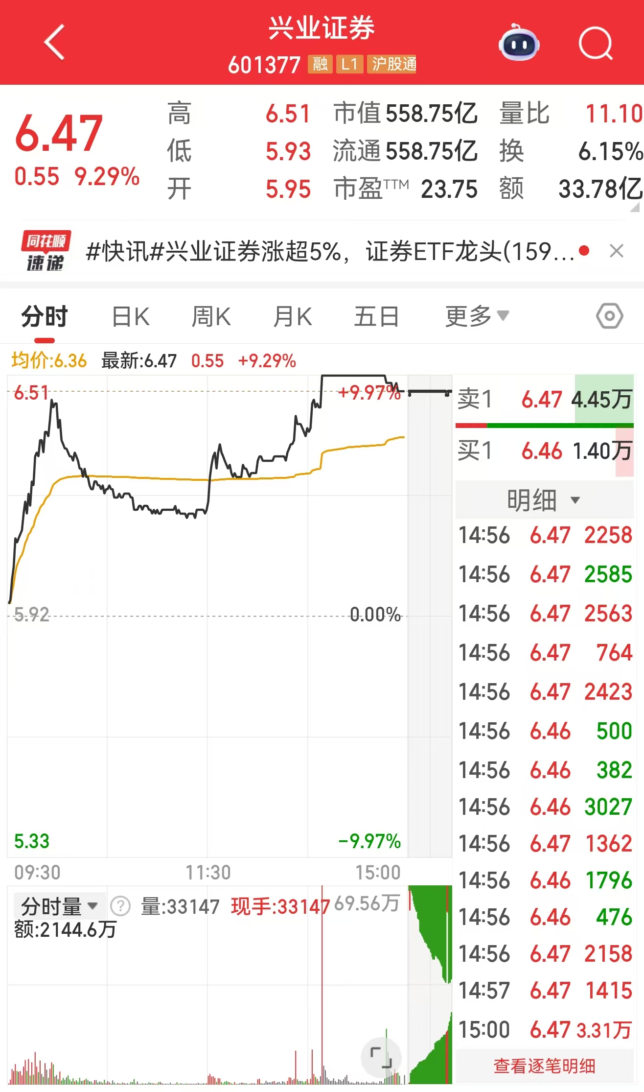 6月11日,興業(yè)證券大漲,午后一度漲停,收盤(pán)最終上漲9.29%,領(lǐng)漲券商板塊。