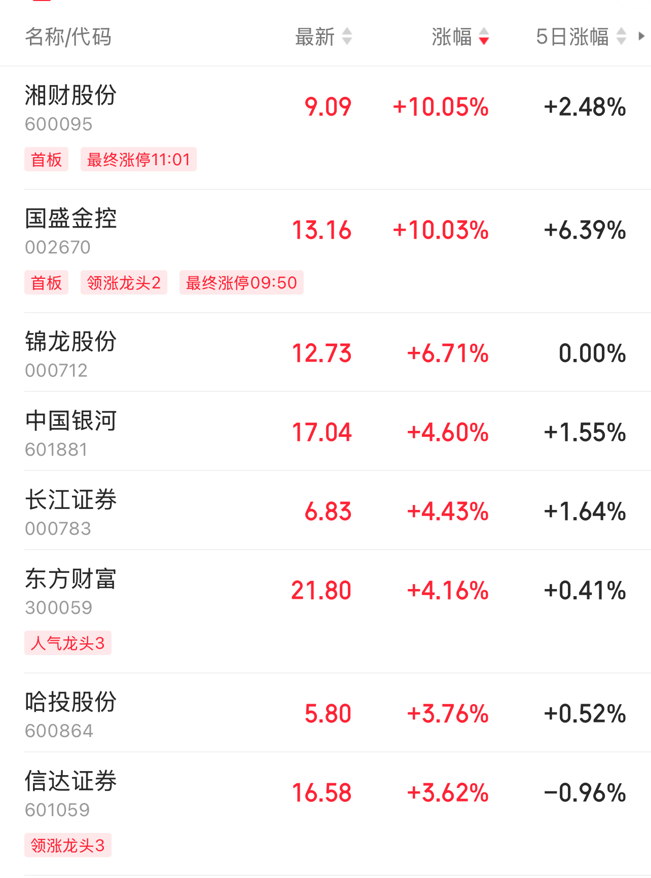 截至午間收盤(pán),證券板塊整體漲幅達(dá)2.91%,成交額已突破350億元,達(dá)到近期高位,顯示出市場(chǎng)資金對(duì)券商板塊的積極關(guān)注與參與。具體來(lái)看,板塊內(nèi)個(gè)股全面上漲,其中,湘財(cái)股份、國(guó)盛金控表現(xiàn)最為亮眼,其股價(jià)在盤(pán)中觸及漲停板;錦龍股份的漲幅也較為可觀,超6%緊隨其后。