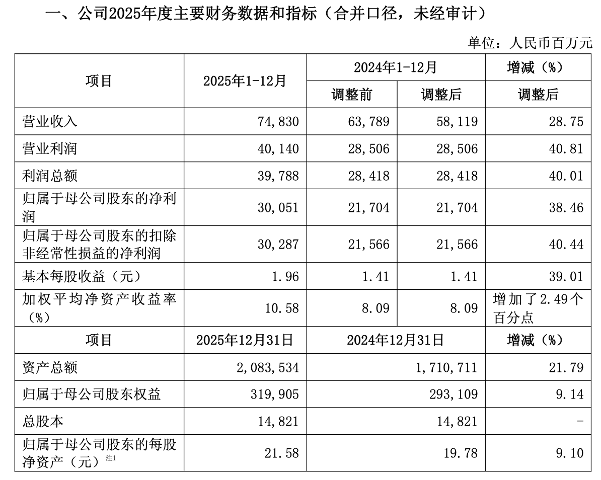 具體來看,2025年,中信證券實(shí)現(xiàn)營業(yè)收入748.3億元,同比增長28.75%;實(shí)現(xiàn)歸屬于母公司股東的凈利潤300.51億元,同比增長38.46%。實(shí)現(xiàn)基本每股收益1.96元,同比增長39.01%;加權(quán)平均凈資產(chǎn)收益率10.58%。