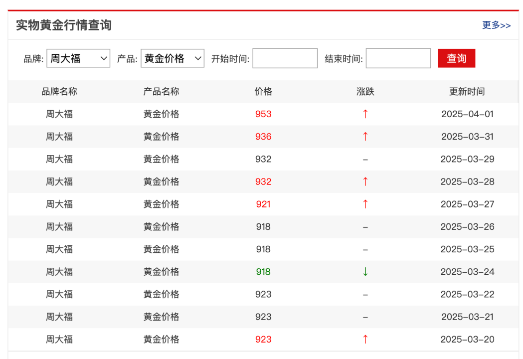 金飾方面,4月1日,周大福黃金價(jià)格報(bào)953元/克,一夜跳漲17元,漲幅為1.82%;此外,按周大福黃金1月2日805元/克的報(bào)價(jià)計(jì)算,一季度周大福黃金價(jià)格累計(jì)漲幅為16.27%,上漲價(jià)格為131元。