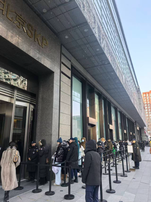 在SKP迎春活動首日,北京、西安、成都、武漢SKP的老鋪黃金門店一如既往出現(xiàn)排隊長龍,今年排隊盛況更超過去年。1月24日上午,記者在北京SKP現(xiàn)場了解到,在1月23日晚間就有數(shù)十人開始徹夜排隊;到1月24日10點(diǎn)北京SKP營業(yè)時間開始,商場已停止發(fā)放老鋪黃金的排隊號牌,總共發(fā)放了約四五百人,相當(dāng)于全天的接待能力。