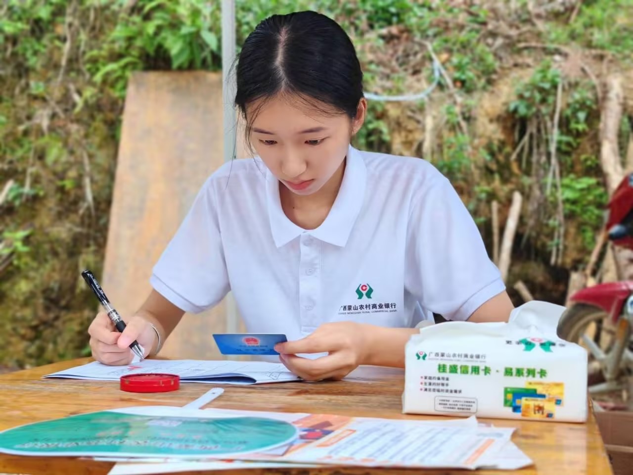 蒙山農(nóng)商銀行漢豪支行工作人員為客戶登記社??ㄙY料 蒙山農(nóng)商銀行供圖