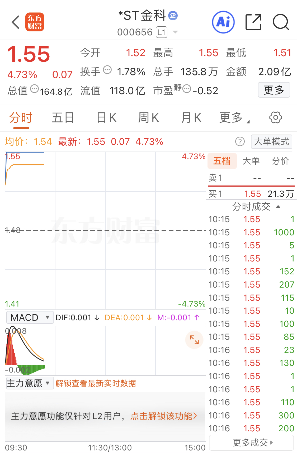 12月16日,*ST金科股價(jià)開盤大幅拉升,最終封于漲停,最新股價(jià)報(bào)1.55元/股,市值164.8億元。12月12日、12月15日、12月16日,該個(gè)股股價(jià)已連續(xù)三個(gè)交易日持續(xù)上漲,累計(jì)漲幅6.16%。