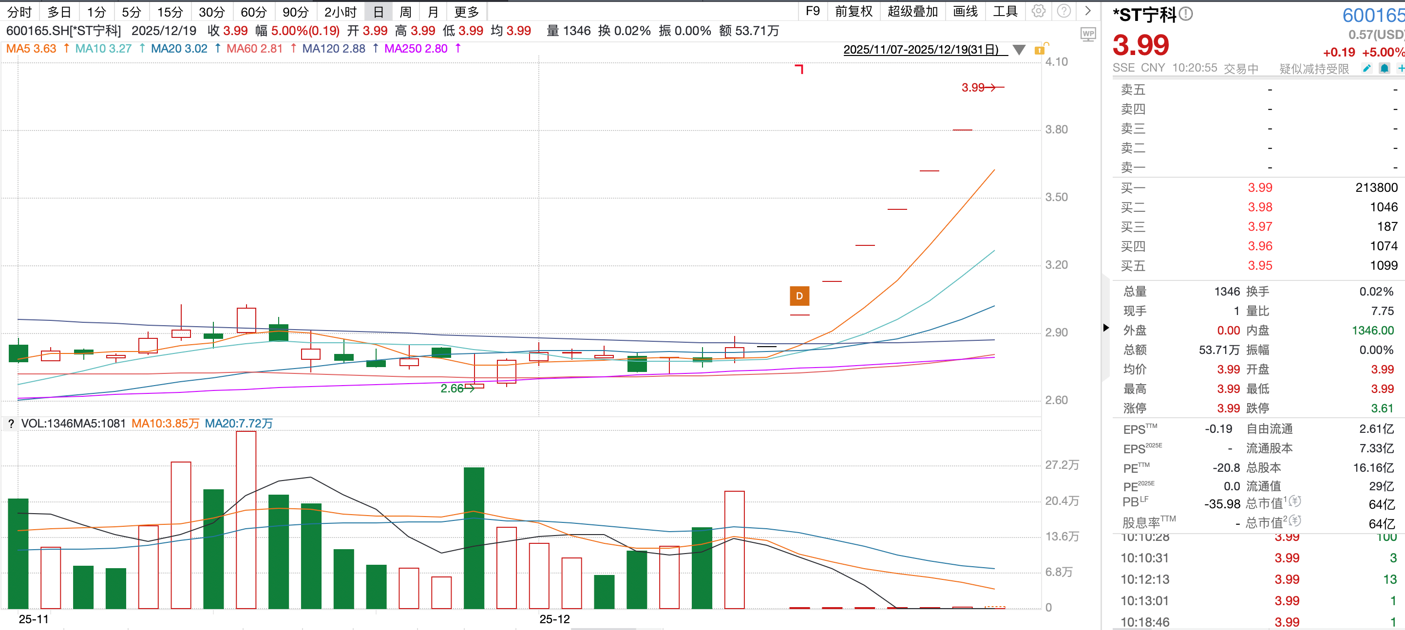 12月19日,寧夏中科生物科技股份有限公司(證券簡(jiǎn)稱:*ST寧科證券代碼:600165.SH)開(kāi)盤(pán)后再度一字漲停。截至早盤(pán)收盤(pán),公司股價(jià)已連續(xù)7個(gè)交易日漲停,報(bào)收3.99元/股。這一強(qiáng)勁表現(xiàn)出現(xiàn)在公司連續(xù)發(fā)布風(fēng)險(xiǎn)提示公告的背景下,引發(fā)市場(chǎng)廣泛關(guān)注。