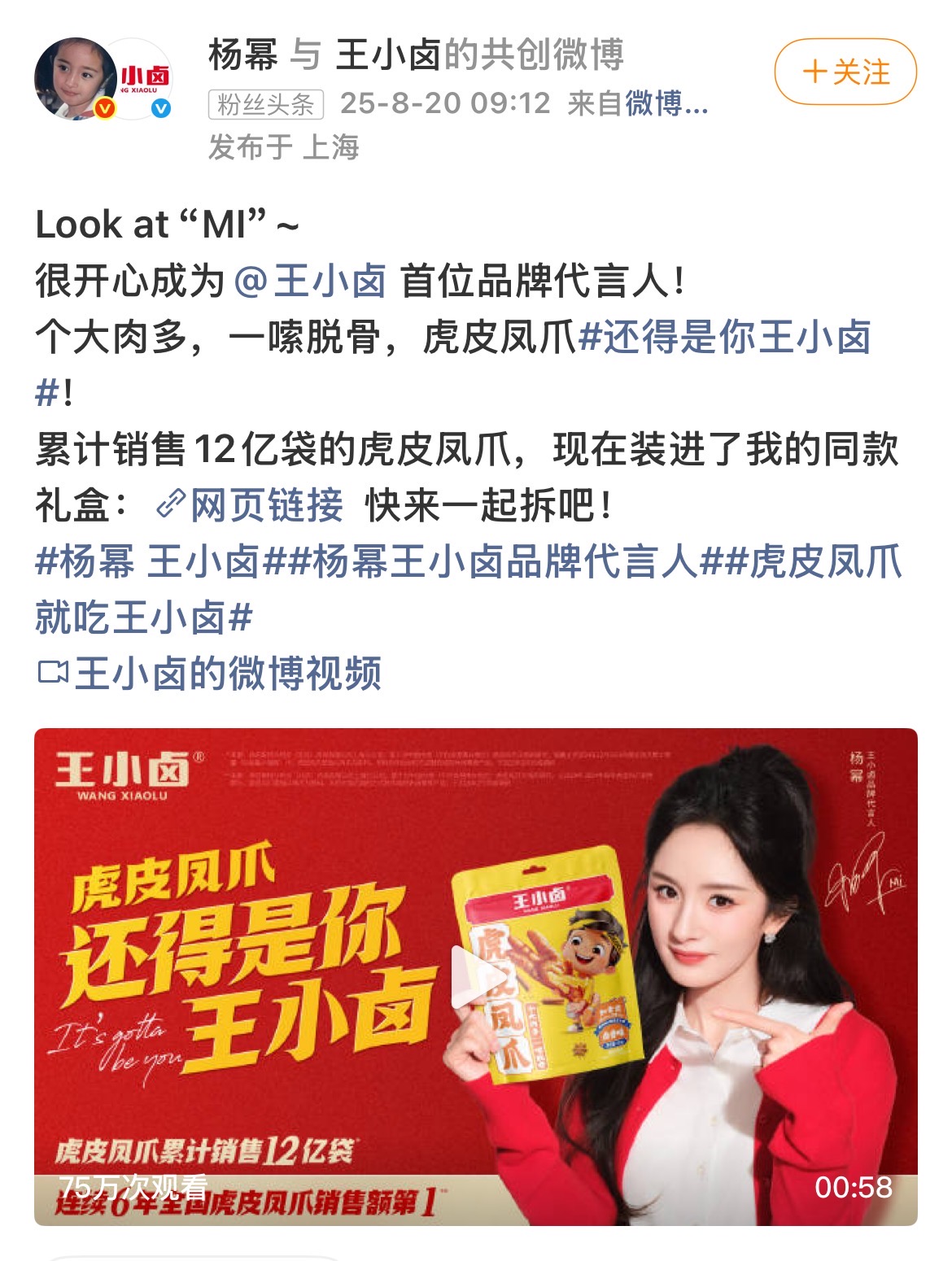 本報訊 (記者梁傲男)8月20日,北京王小鹵網(wǎng)絡科技有限公司(以下簡稱“王小鹵”)官宣楊冪為首位品牌代言人。當日9時12分,“楊冪x王小鹵”品牌代言人官宣限定禮盒全網(wǎng)首發(fā)。