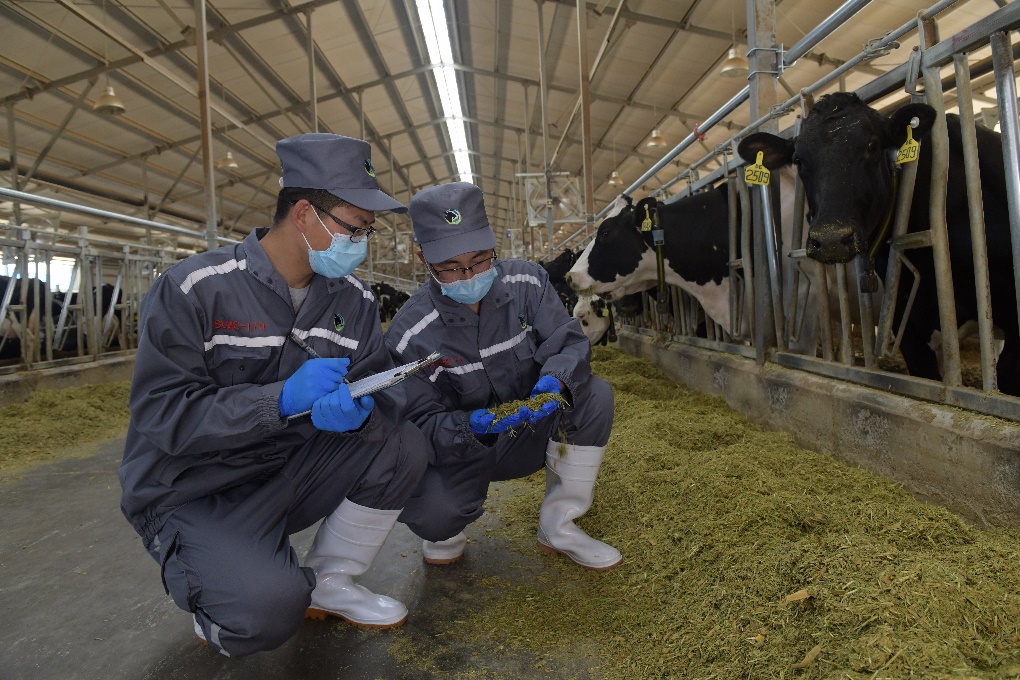 牧場工作人員研究優(yōu)化奶牛日糧配方