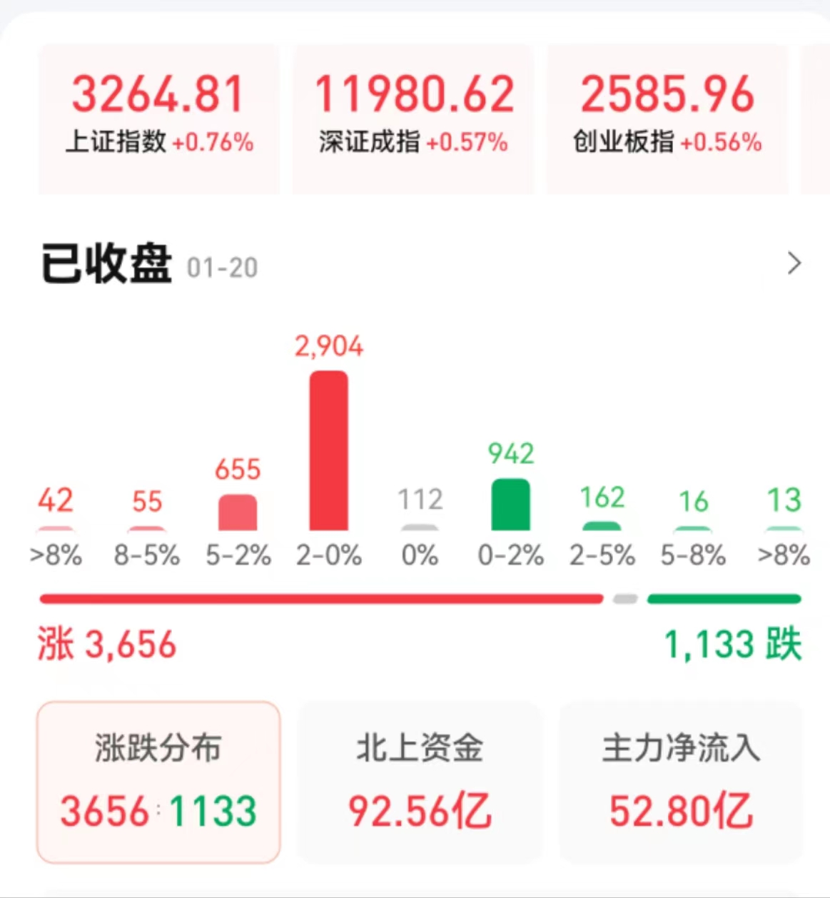 周五(1月20日),A股主要指數(shù)震蕩上行,全線飄紅。截至收盤,上證指數(shù)漲0.76%,報(bào)3264.81點(diǎn);深證成指漲0.57%,報(bào)11980.62點(diǎn);創(chuàng)業(yè)板指漲0.56%,報(bào)2585.96點(diǎn);科創(chuàng)50指數(shù)漲0.54%,報(bào)1029.14點(diǎn)??傮w上看,兩市個(gè)股漲多跌少。其中,漲停個(gè)股達(dá)27只,跌停個(gè)股達(dá)10只。