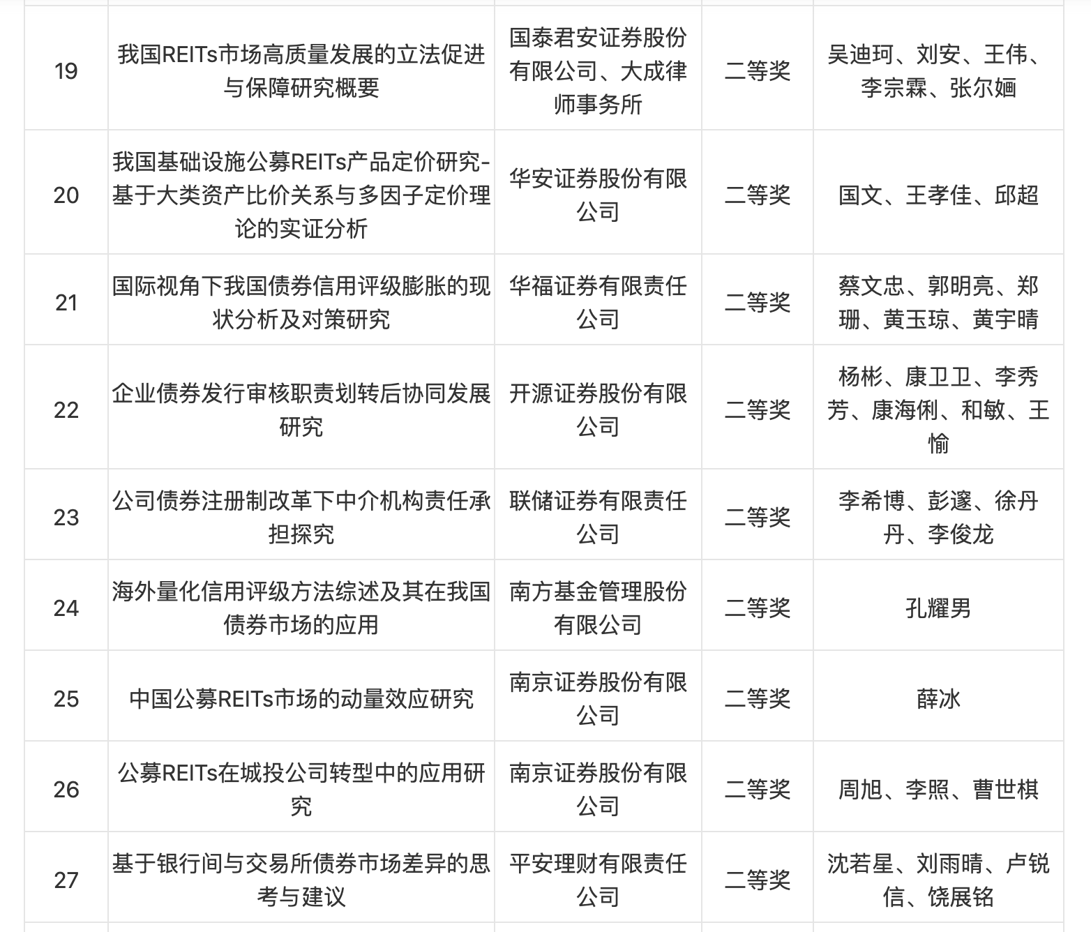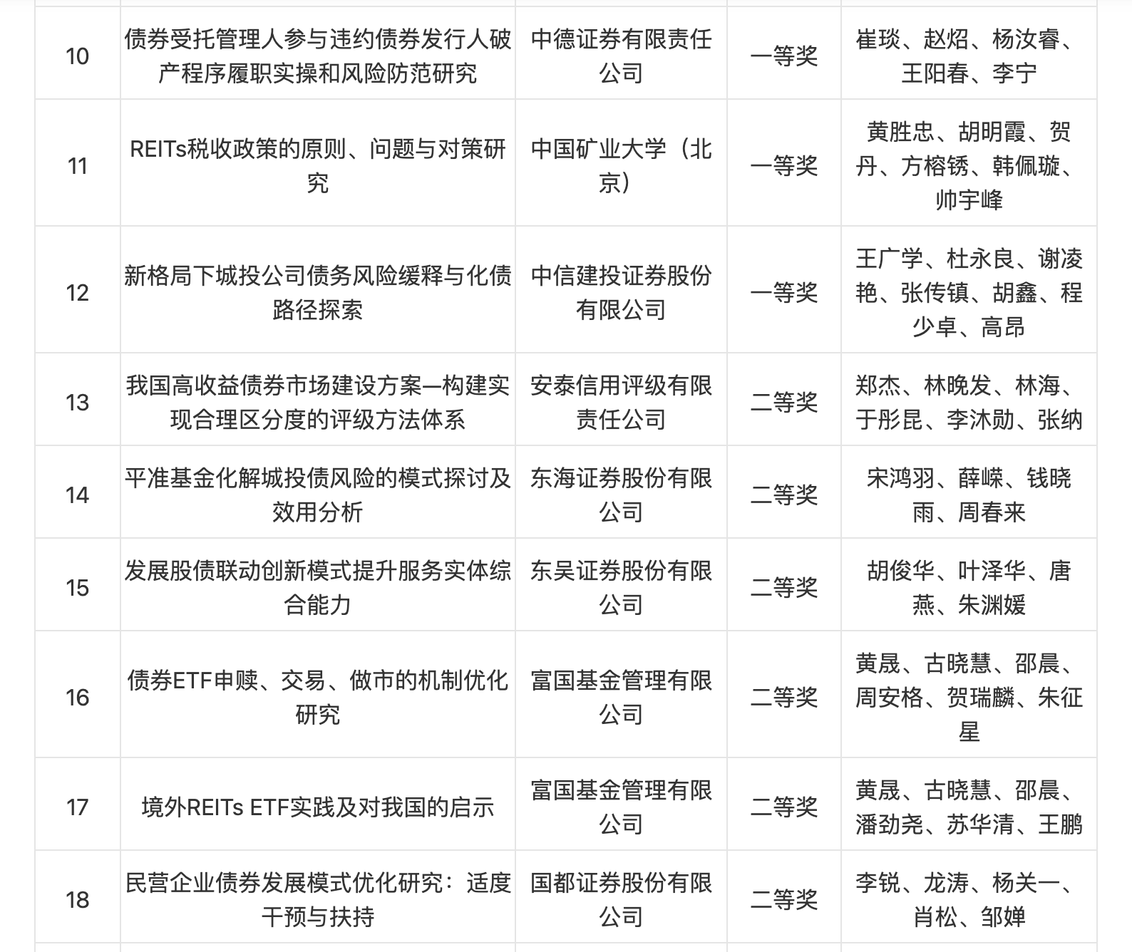 此次征集共收到證券公司、基金公司、商業(yè)銀行、銀行理財(cái)、評(píng)級(jí)機(jī)構(gòu)、高等院校等單位申報(bào)的128篇研究報(bào)告,研究?jī)?nèi)容涵蓋債券發(fā)行定價(jià)與投資交易、債券市場(chǎng)服務(wù)實(shí)體經(jīng)濟(jì)、債券風(fēng)險(xiǎn)防范處置、REITs市場(chǎng)建設(shè)等主題。
