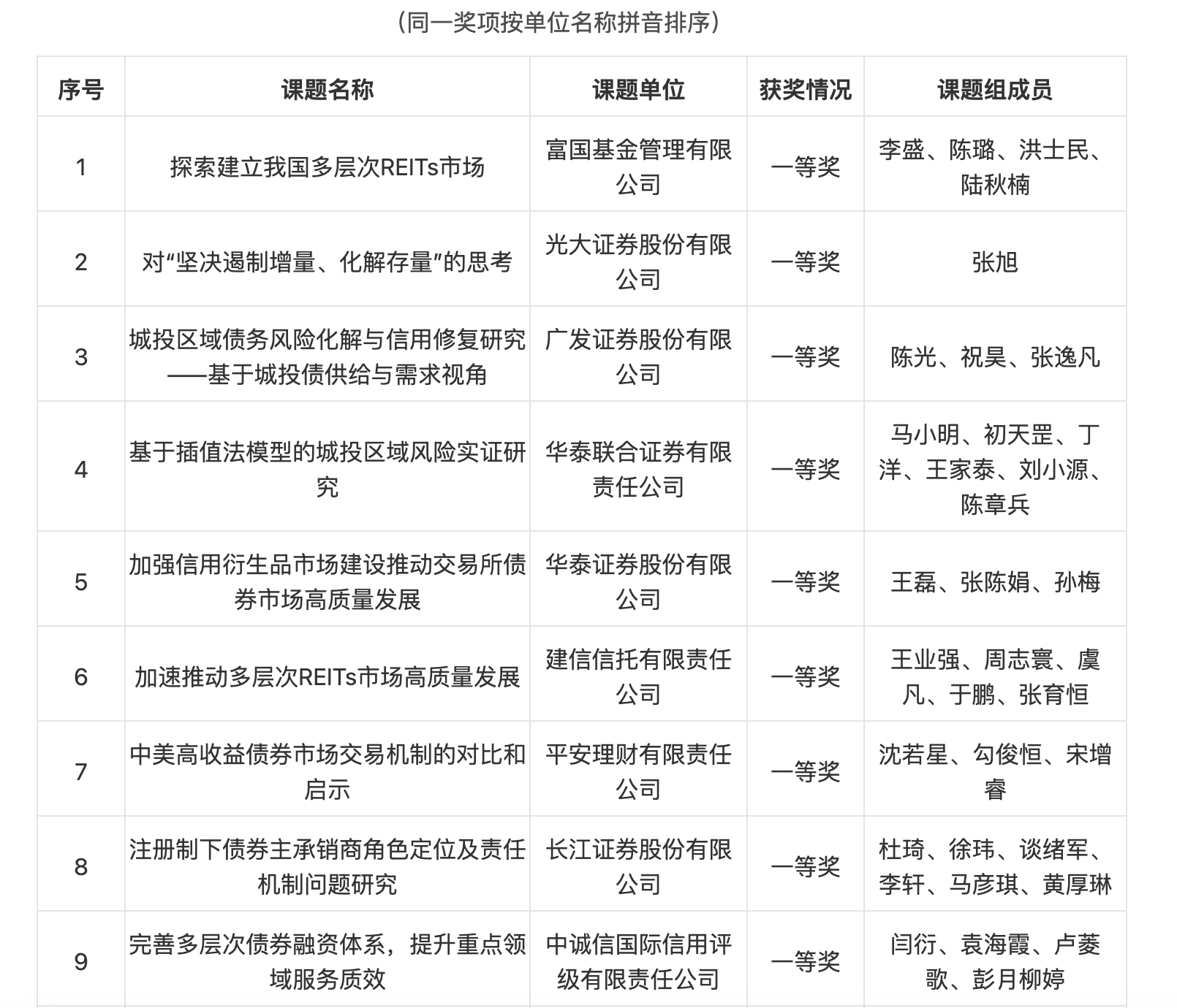 滬深證券交易所組織證券業(yè)協(xié)會(huì)、基金業(yè)協(xié)會(huì)、行業(yè)專(zhuān)家等成立評(píng)審組,經(jīng)過(guò)3輪評(píng)審,最終擇優(yōu)評(píng)選出一等獎(jiǎng)?wù)n題12項(xiàng)、二等獎(jiǎng)?wù)n題24項(xiàng)、優(yōu)秀獎(jiǎng)?wù)n題32項(xiàng)。