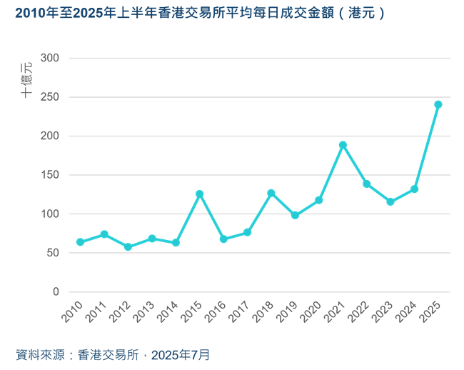 數(shù)據(jù)顯示,2025年上半年,香港市場平均每日成交金額為2402億港元,較去年同期的1104億港元增長118%。市值方面,截至2025年6月底,香港市場的市值為42.7萬億港元,較去年同期的32.1萬億港元增長33%。