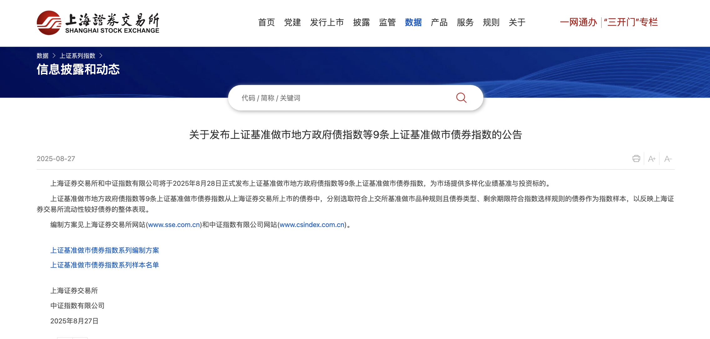 本報(bào)訊 (記者毛藝融)8月27日,記者從上海證券交易所獲悉,上海證券交易所和中證指數(shù)有限公司將于2025年8月28日正式發(fā)布上證基準(zhǔn)做市地方政府債指數(shù)等9條上證基準(zhǔn)做市債券指數(shù),為市場(chǎng)提供多樣化業(yè)績(jī)基準(zhǔn)與投資標(biāo)的。