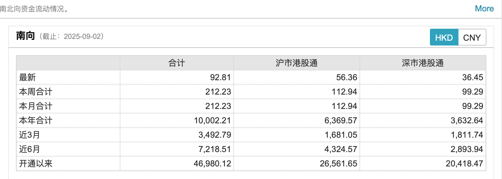 今年以來,南向資金凈流入額超萬億港元。Wind資訊數(shù)據(jù)顯示,截至9月2日收盤,當(dāng)日南向資金凈流入92.81億港元。至此,年內(nèi)南向資金凈流入規(guī)模約10002.21億港元,超過萬億港元。